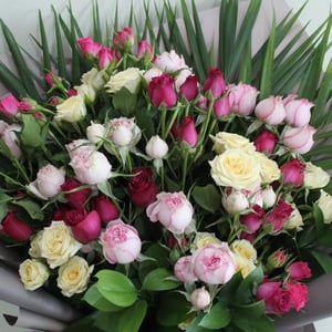 Bouquet 'Sunny Day: yellow, white and violet Chrysanthemums'