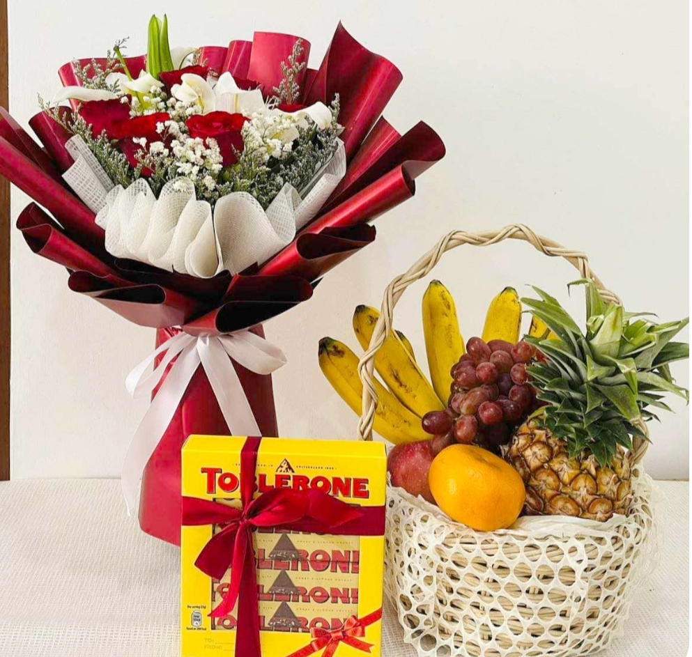 A bundle gift consist a flowers bouquet, fruit basket, and a box of chocolate