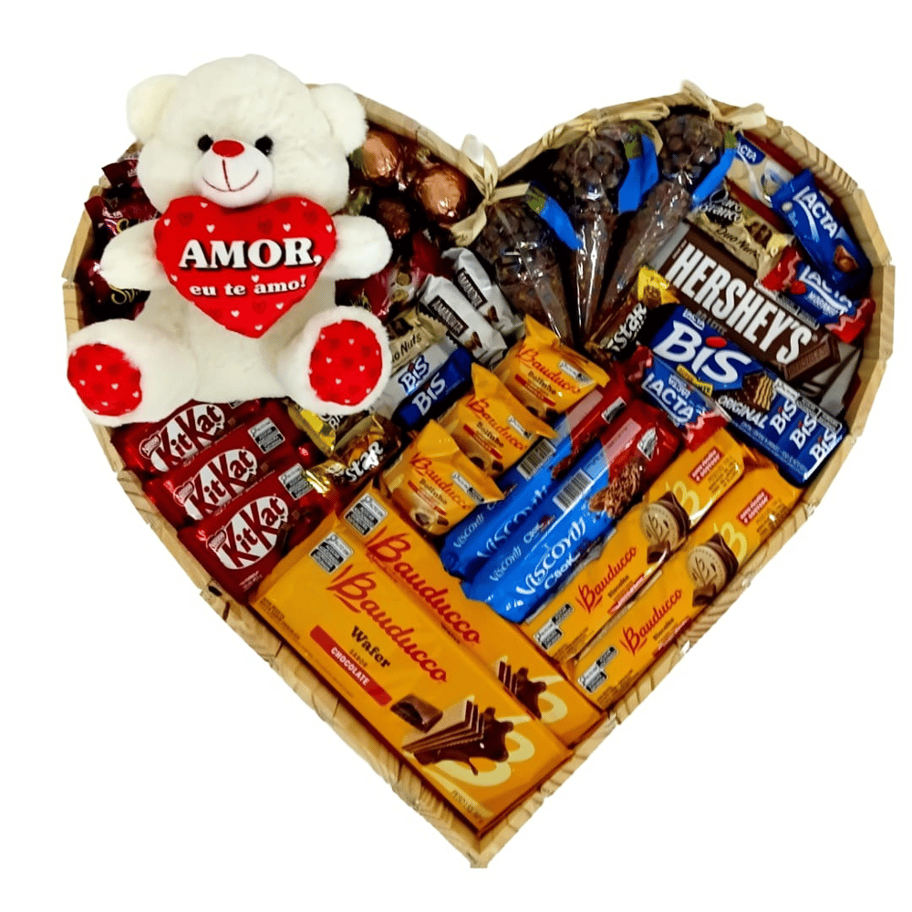 coração de 60 cm contendo: - 1 Pelúcia de urso - 2 Biscoitos Waffers Bauducco - 2 biscoitos recheados Bauducco - 2 biscoitos coockies Visconti - 1 caixa de chocolate bis - 1 barra de chocolate…