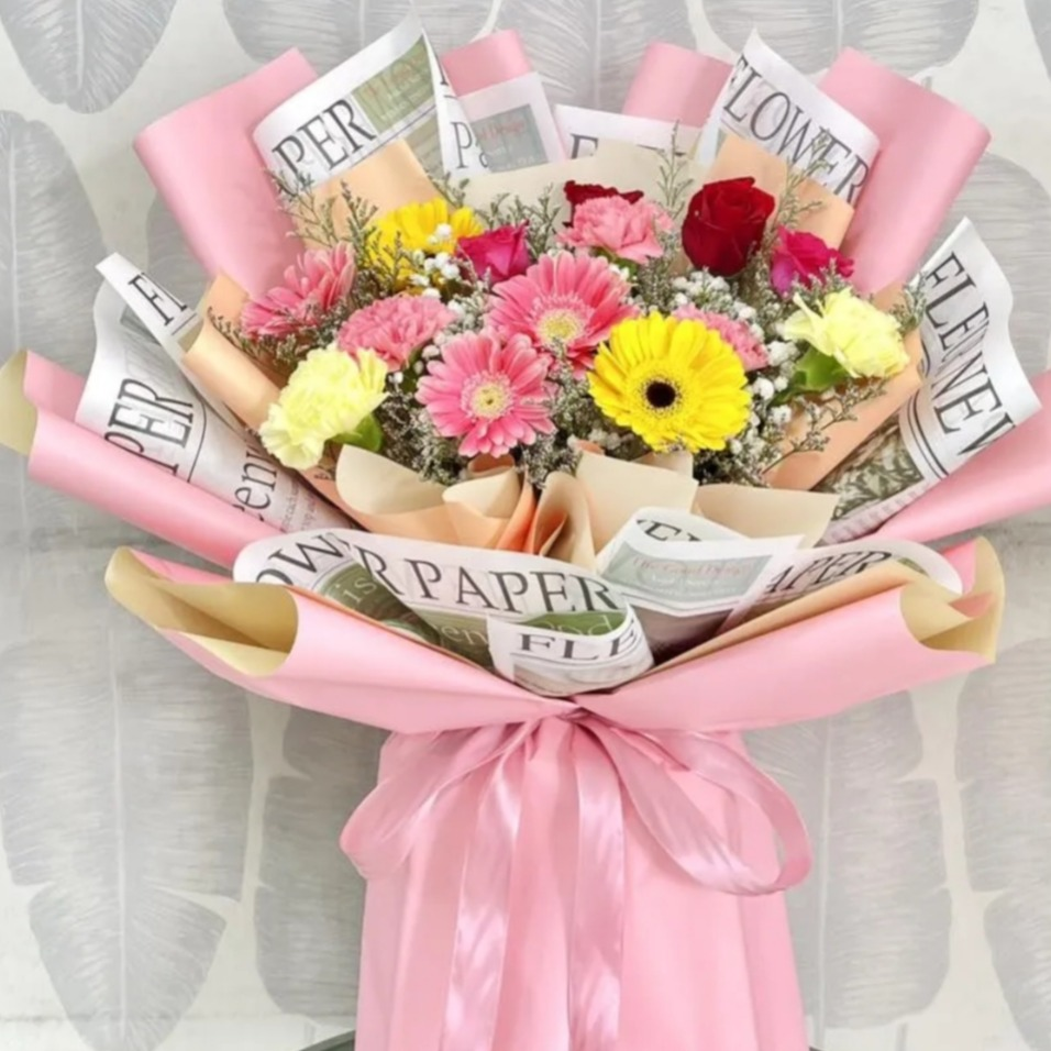 A beautiful bouquet of roses, carnation and gerberas with some fillers and greens.