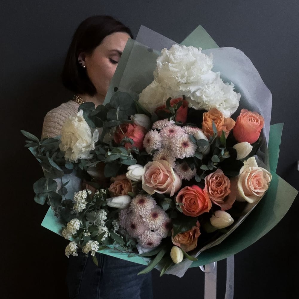Bouquet features hydrangea, roses, mums, tulips, carnations, greenery, eucalyptus. The size is Medium. The high is 50sm. Note: We are working with the fresh seasonable flowers, so the com…